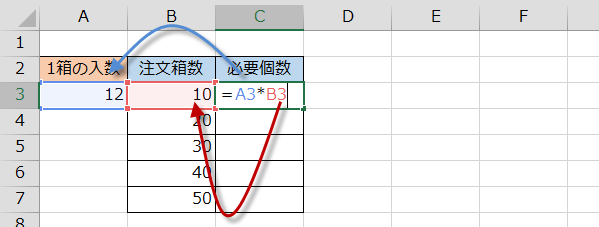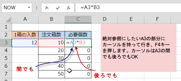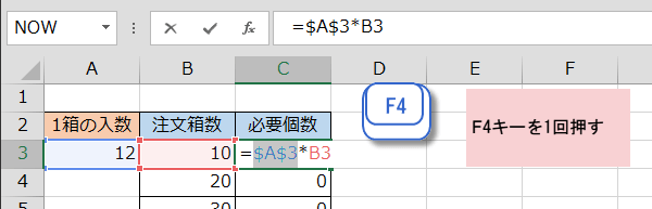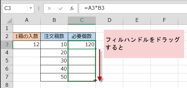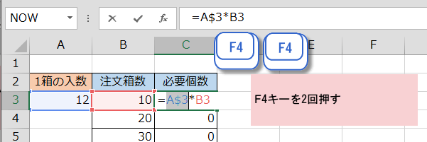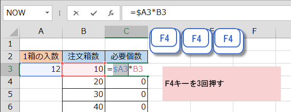 1箱に12個という数は絶対に変化しないので、A3を変化しない印$をつけてからコピーします。