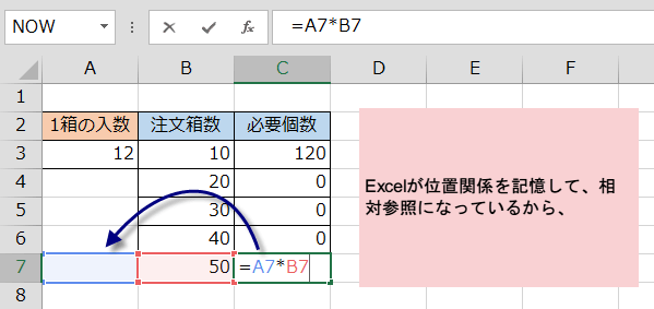 Excelで数式をコピーする時に、コピー元とコピー先にの位置関係を保ったまま、セル参照が自動的に変化します。