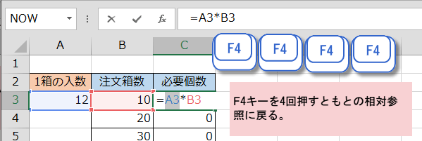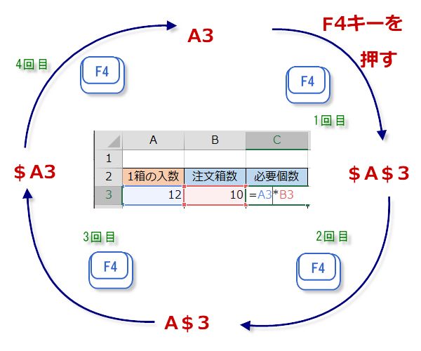 セル参照の行と列のいずれか一方の先頭に$をつける形式を複合参照と呼びます。F4キーを1回押すごとに、数式中のA3が、「$A$3」「A$3」「A$3」「A3」と変化します。