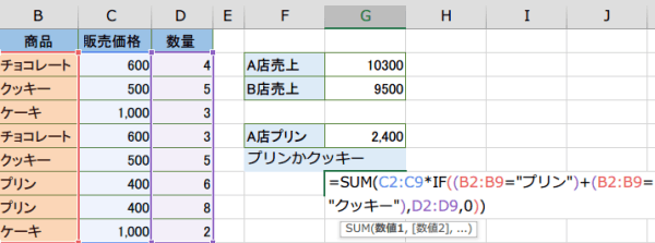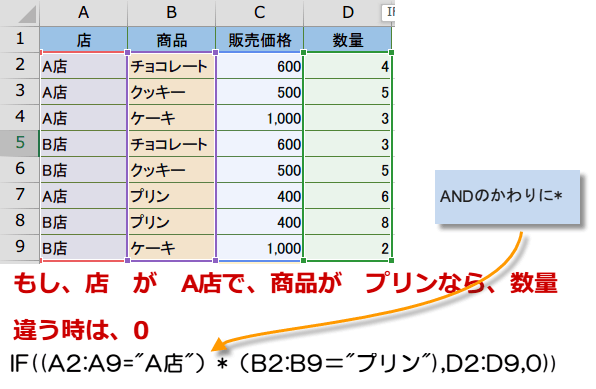 IF((A2:A9="A店")*(B2:B9="プリン"),D2:D9,0))