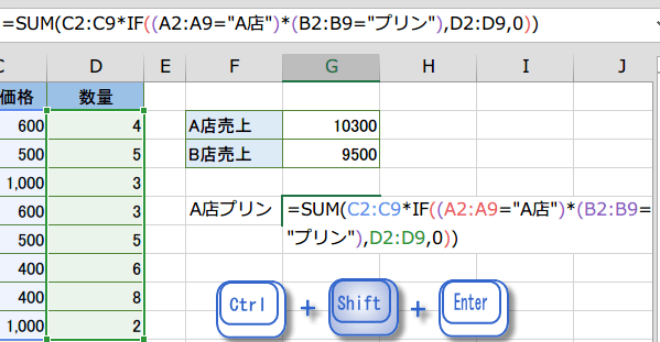=SUM(C2:C9*IF((A2:A9="A店")*(B2:B9=”プリン”),D2:D9,0)))