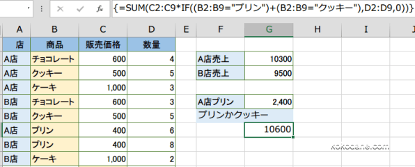 =SUM(C2:C9*IF((B2:B9="プリン")+(B2:B9="クッキー"),D2:D9,0))