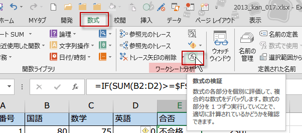 数式リボンのワークシート分析グループにある数式の検証ボタンをクリックします。