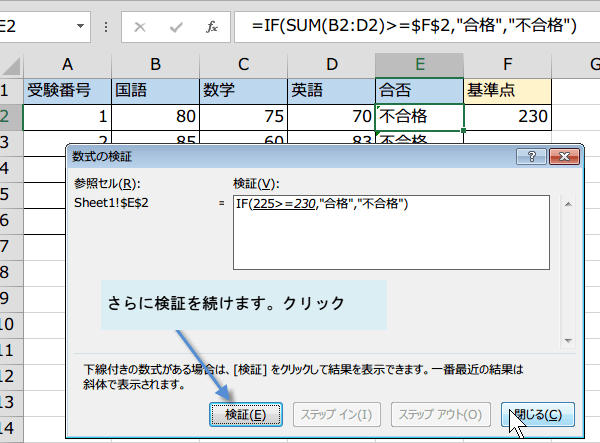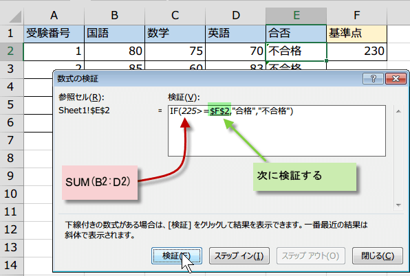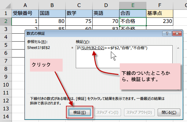 数式の検証機能を使うには、数式を検証するセルをクリックし、