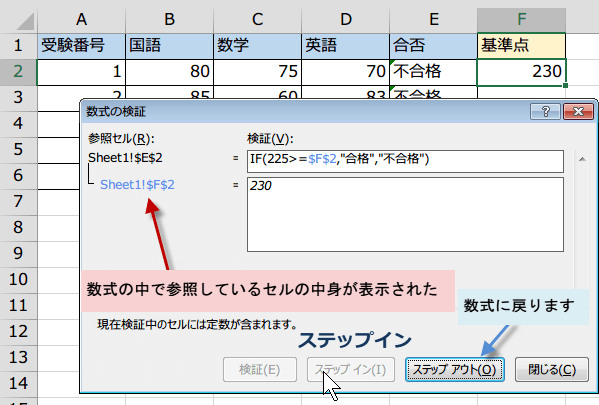 ステップインをクリックすると、数式で参照しているセルの中身230が表示されました。