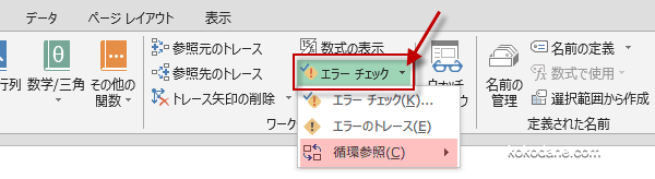 数式リボンのエラーチェックボタンの▼をクリックします。