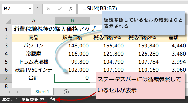 循環参照とは、その数式が入力されているセル自体を参照する数式のことです。