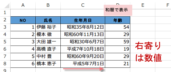 そのデータが文字列として入力されているのか、それとも日付(シリアル値)で入力されていて、前頁のように表示形式で和暦になっているのかを確認しましょう。
