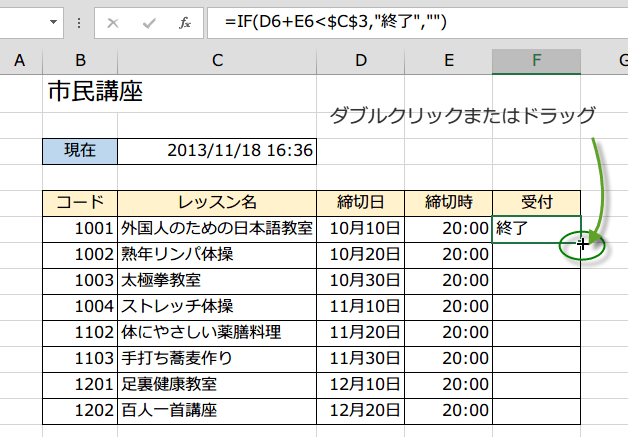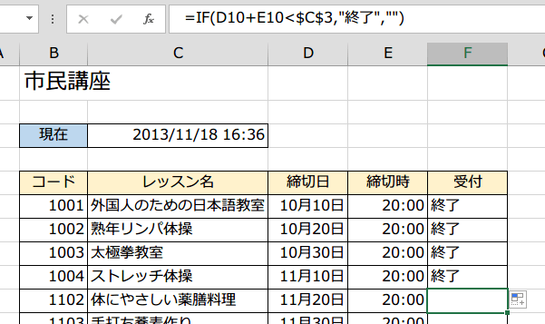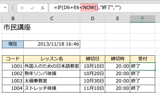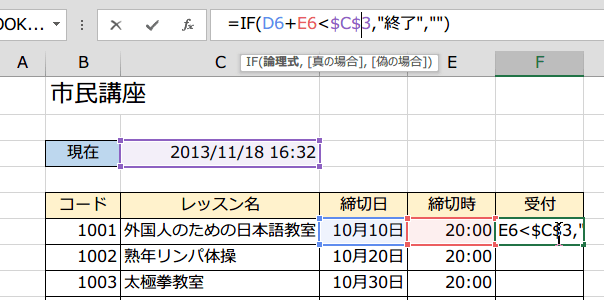 締切日(D6)+締切時間(E6)< 今日の日時 $C$3 なら終了