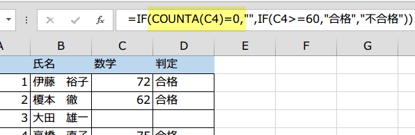 =IF(COUNTA(C4)=0,"",IF(C4>=60,"合格","不合格"))