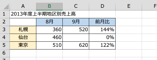 以下の表では、売上が未入力でも前月比欄が表示されています。