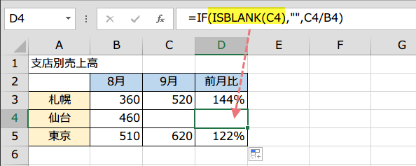 先ほどのD2セルに入力された式に、ISBLANK関数をネストします。