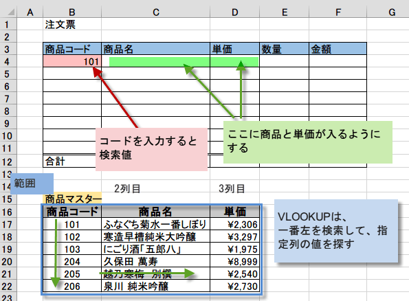 今回は、VLOOKUP関数を使って、Excelの注文票にコードを入力すれば、自動で単価と金額が検索されて表示されるしくみを作ります。