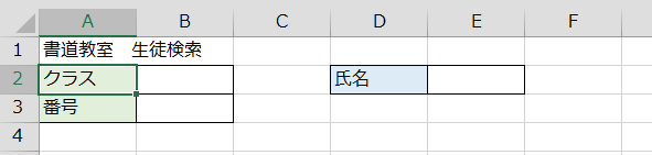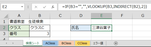 下記のような生徒検索シートがあり、3クラス分の生徒名簿が別シート上にあります。生徒名簿がいくつあっても大丈夫ですが、今回は3クラスです。