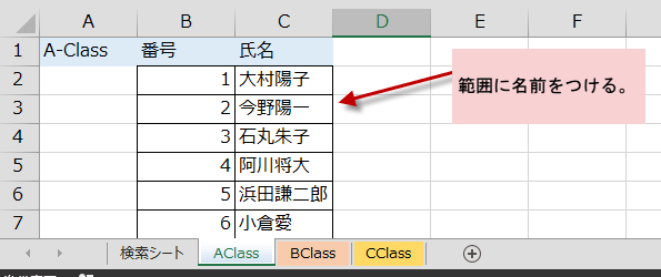 準備として、それぞれのクラスごとに、範囲を名前定義します。