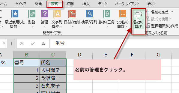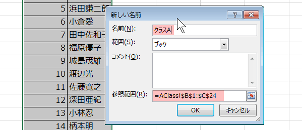 生徒名簿の範囲に名前を定義して参照しやすく