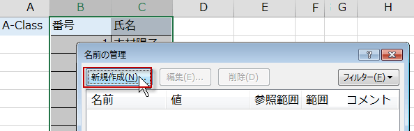名前の管理ダイアログボックスが表示されたら、新規作成ボタンをクリックします。