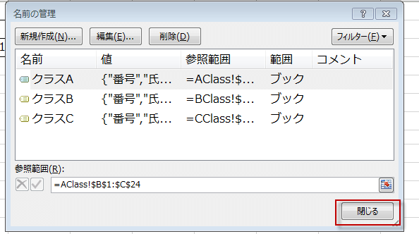 名簿のクラスごとに名前をつけ、範囲を指定します。これをクラスの数だけ作成します。