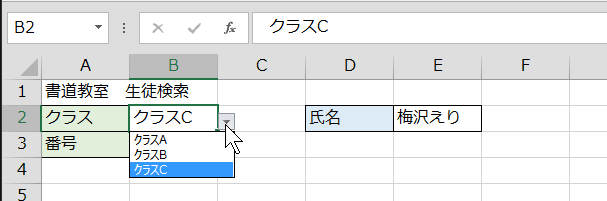 クラス名を入力するセルB2は、3つのクラス名をリストにしておけば、なおいっそう入力がスピーディになります。