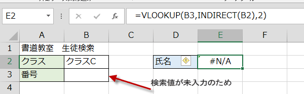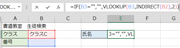 そこで、IF関数を使って、もしB3が空白なら、何も表示しないで、空白出ない時は、VLOOKUP(B3,INDIRECT(B2),2)を実行という式に修正します。
