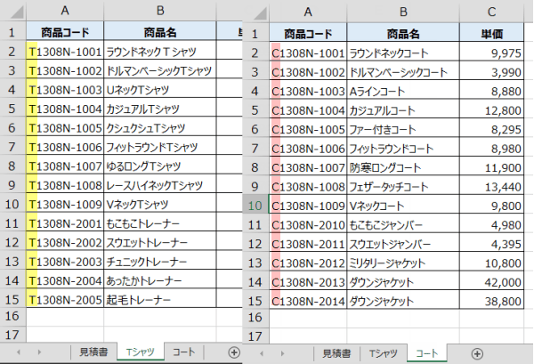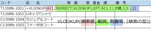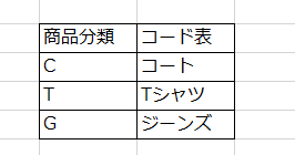 例では、Tがついているのは、Tシャツのコード表を参照し、Cが付いているコードからは、コートのコード表を参照するというわけです。