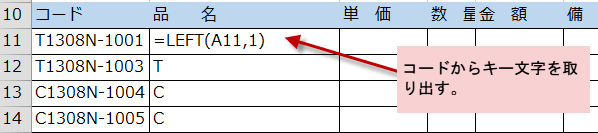 A11セルから、T1308N-1001というコードの検索キーであるTを取り出します。式は、LEFT関数を使って、左から1文字を取り出せば良いです。