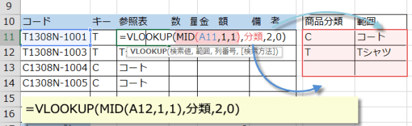=VLOOKUP(MID(A12,1,1),分類,2,0)