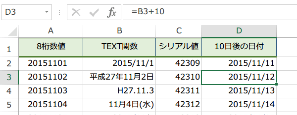 TEXT関数を使って8桁の数値を日付のシリアル値に変換しているので、日付の計算もできます。