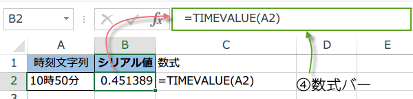 下図では、B2セルを選択すると、B2セルに入力されている数式が表示されます。
