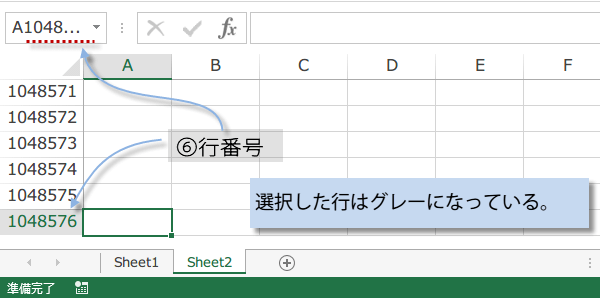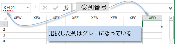 列番号はAからZまで来ると、次はAA、AB〜AZまでくると、その次はBA〜BZと続きます。最右端はXFDです。選択した列はグレーになり、他の列と区別しやすくなっています。