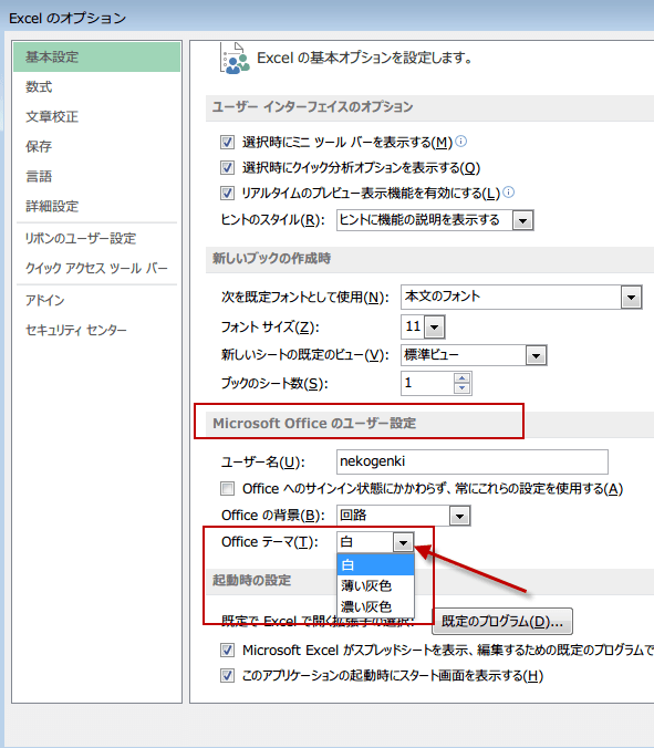 ExcelのオプションWindowが開くので、基本設定メニューから、Officeテーマの白、薄い灰色、濃い灰色から選択します。