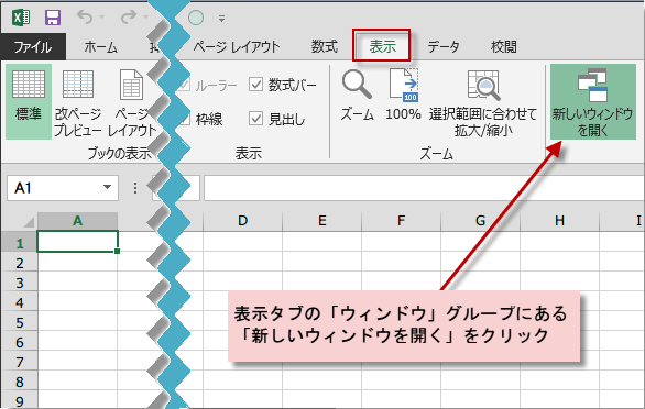 表示タブの「ウィンドウ」グループにある「新しいウィンドウを開く」をクリック