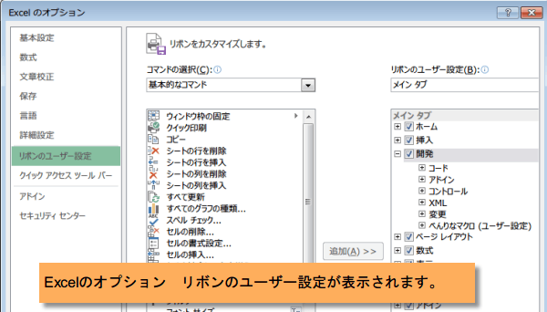 Excelのオプション リボンのユーザー設定が表示されます。