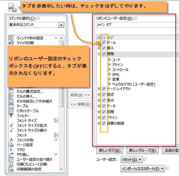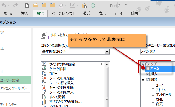 タブを非表示したい時は、リボンのユーザー設定のチェックボックスのチェックをはずしてやります。