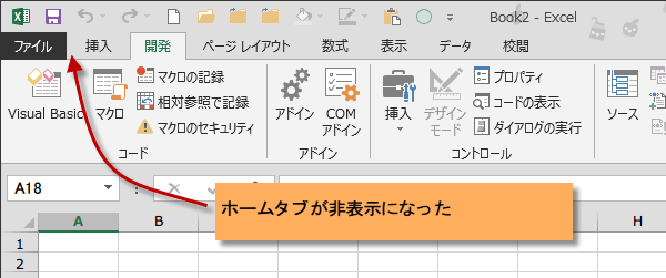 リボンにあったホームタブが非表示になりました。