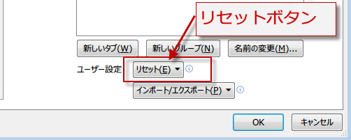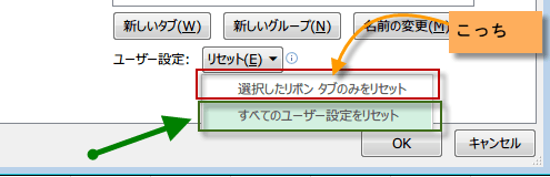 選択したリボンタブのみをリセットと、すべてのユーザー設定をリセットです。