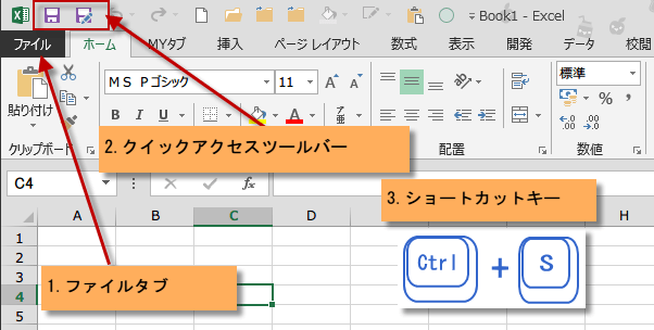 2.クイックアクセスツールバーに上書き保存、名前を付けて保存コマンドを登録し利用します。