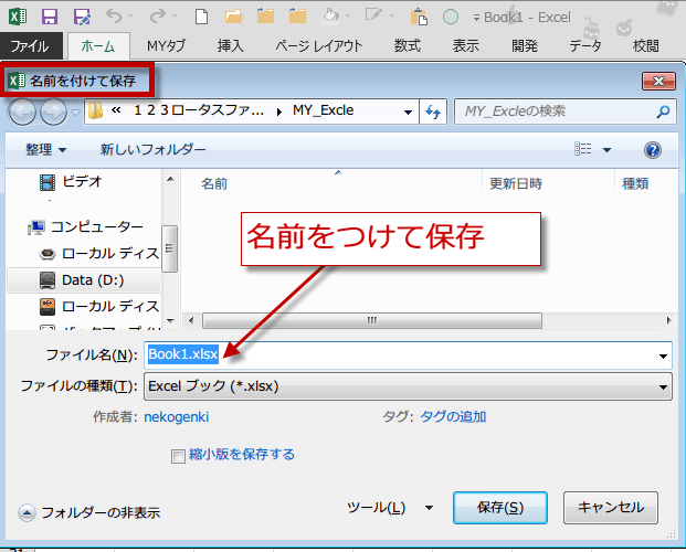 新規ブックでまだ名前がない場合は、どの方法でも名前をつけて保存ダイアログボックスが表示されます。名前をつけて保存します。
