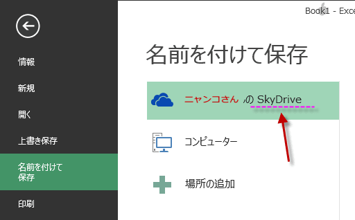 サインインしている時は、バックステージビューから「名前を付けて保存」をすると、デフォルトで保存先が「SkyDrive」になっています。