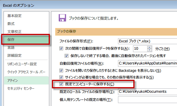 左側のメニューで保存を選択し、ブックの保存にある、「既定でコンピューターに保存する」にチェックを入れます。