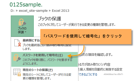 [ファイル] タブの [情報] にある[ブックの保護]からのパスワードを使用しての暗号化は、Excel2010,Excel2013共通です。