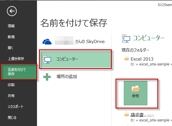 「名前を付けて保存」をクリックし、ファイルを保存する場所(例ではコンピューター)をクリックし、参照をクリックします。