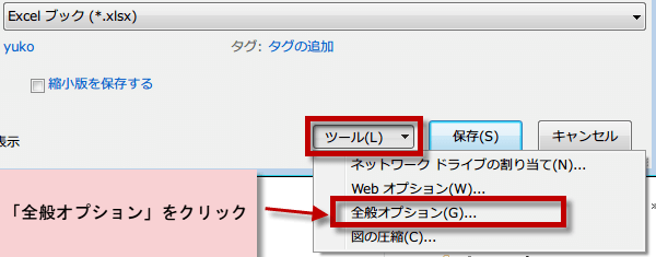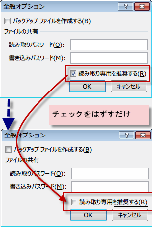 「全般オプション」で「読み取り専用を推奨する」のチェックをはずして保存します。
