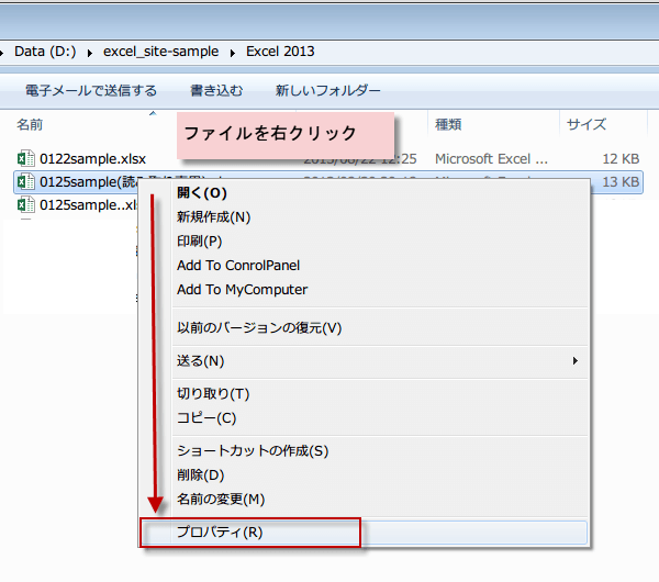 ファイルを保存してある場所を開き、読み取り専用にしたいファイルを右クリックします。