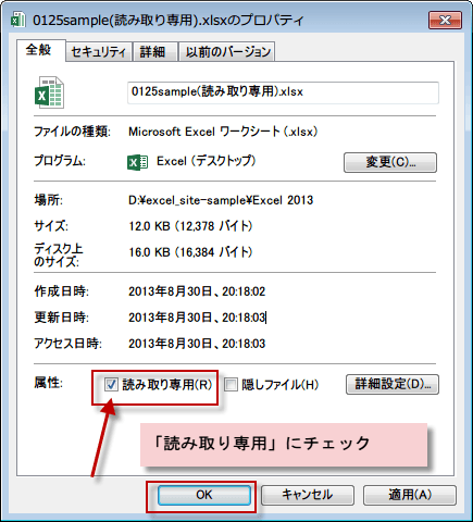下部にある属性の「読み取り専用」にチェックを入れ、OKボタンをクリックします。
