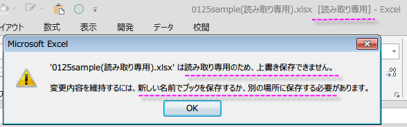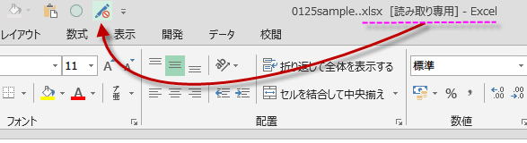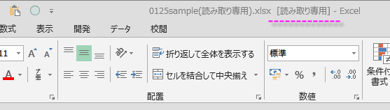 ファイルを開く時にメッセージは表示されませんが、タイトルバーのファイル名の後ろに、[読み取り専用]と表示されています。