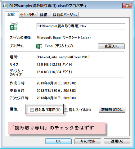 「読み取り専用」のチェックを外します。