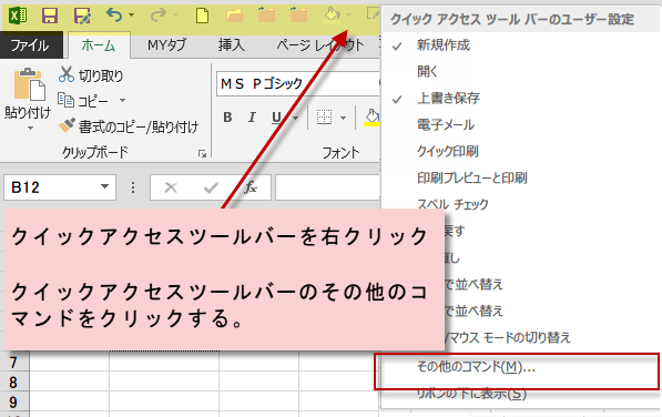 クイックアクセスツールバーに読み取り専用の設定・解除ボタン表示するには、まず、クイックアクセスツールバーを右クリックします。