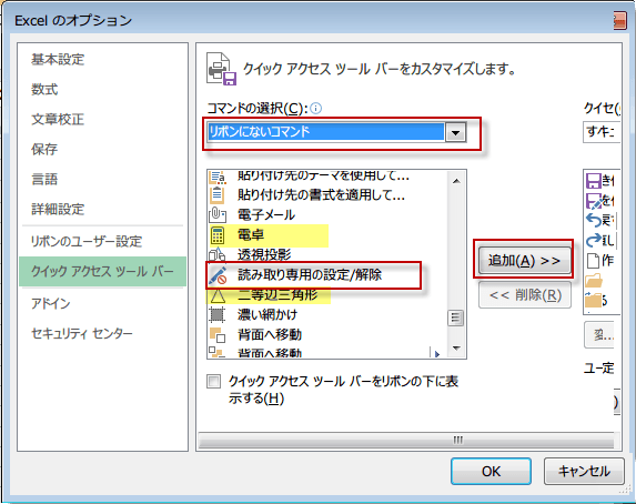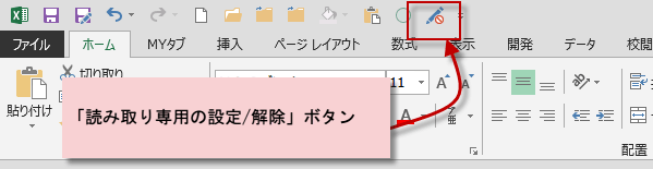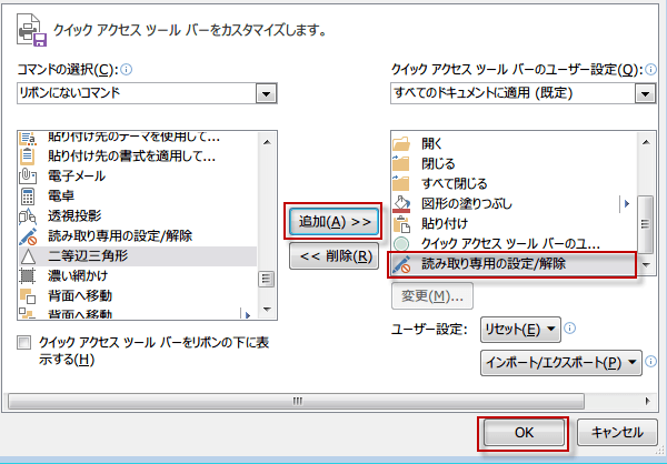 読み取り専用の設定・解除ボタンをクイックアクセスツールバーに表示するには