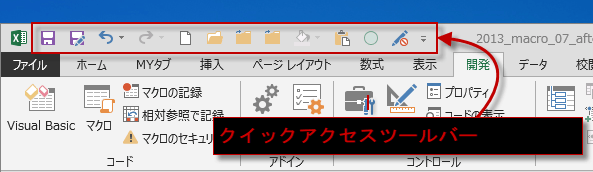 マクロを記録したり、実行するときに、「開発」タブの「コード」グループを表示するのを省略するために、クイックアクセスツールバーにコマンドを登録しておくと便利です。